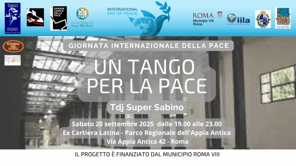 L’Associazione culturale TangoEventi invita tutti i cittatidini a partecipare alla terza edizione di “Un Tango per la Pace” III°Edizione che si svolgerà nella Ex Cartiera latina Via Appia Antica 42 Roma, con il patrocinio di Municipio VIII di Roma Capitale e l’I.L.A (Organizzazione Internazionale Italo-Latino Americana) e dell’Ambasciata dell’Uruguay, Grande Canale della Pace. Si tratta di un evento gratuito con prenotazione obbligatoria entro il 19 c.m. (Info e prenotazioni 3398209385, inizio ore 19.00, termina alle 23.00