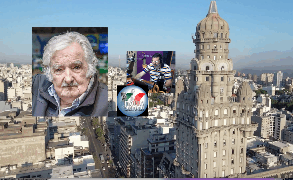 Foto: sullo sfondo della capitale Montevideo, nei riquadri José Mujica, Alessandro Maggi e il logo del programma radiofonico uruguaiano ‘Italia per Tutti