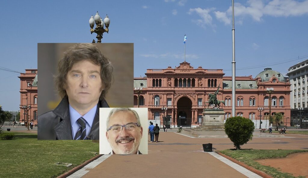 (Foto: sullo sfondo della Casa Rosada a Buenos Aires, sede della Presidenza della Repubblica argentina, nel riquadro grande il Presidente Javier Milei insieme a Fernando Ayala)